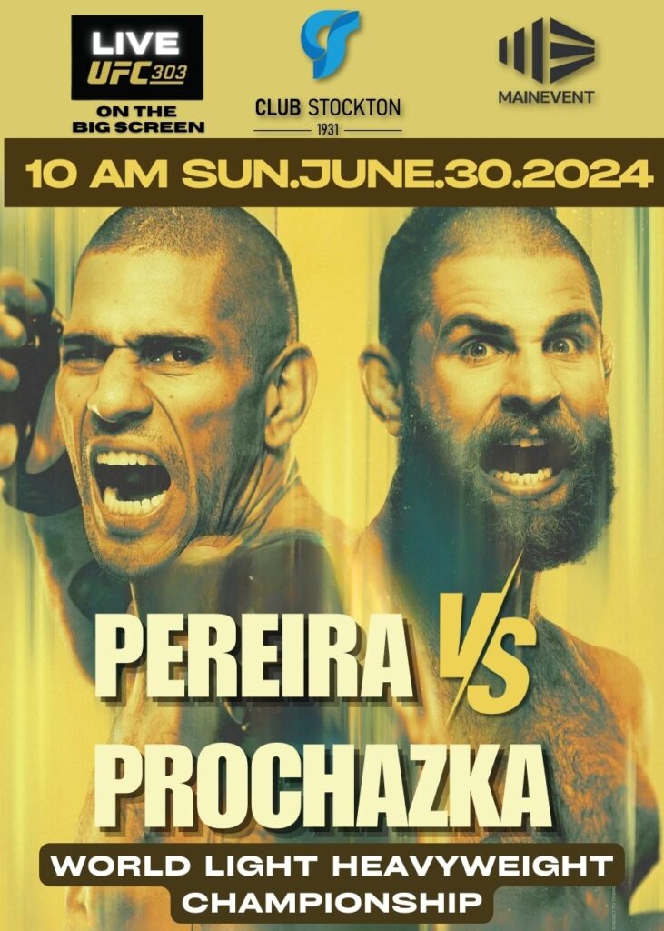 The UFC’s current MVP and light heavyweight champion, Alex Pereira, is set to face former champion Jiri Prochazka in a highly anticipated rematch. UFC 303: Pereira vs. Procházka 2 is an upcoming mixed martial arts event produced by the Ultimate Fighting Championship, scheduled for Sunday, June 30, 2024. The event will be screened live at Club Stockton.